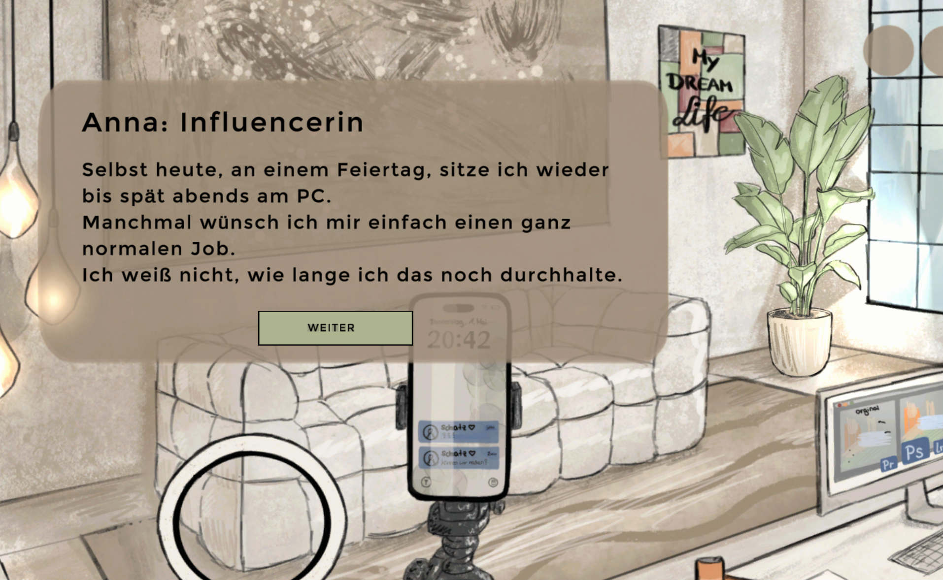 In meinem interaktiven Spiel begibst du dich in den Alltag einer scheinbar perfekten Influencerin/Content Creatorin. Beim Erkunden ihres digital inszenierten Lebensraums kannst du verschiedene Objekte anklicken. Hinter jedem verbirgt sich ein persönlicher Gedanke, eine Wahrheit oder eine Unsicherheit, die im glänzenden Social-Media-Image verborgen bleibt. Mit Illustrationen, Animationen und Sounds entsteht eine visuelle Erzählung, die zum Nachdenken anregt.